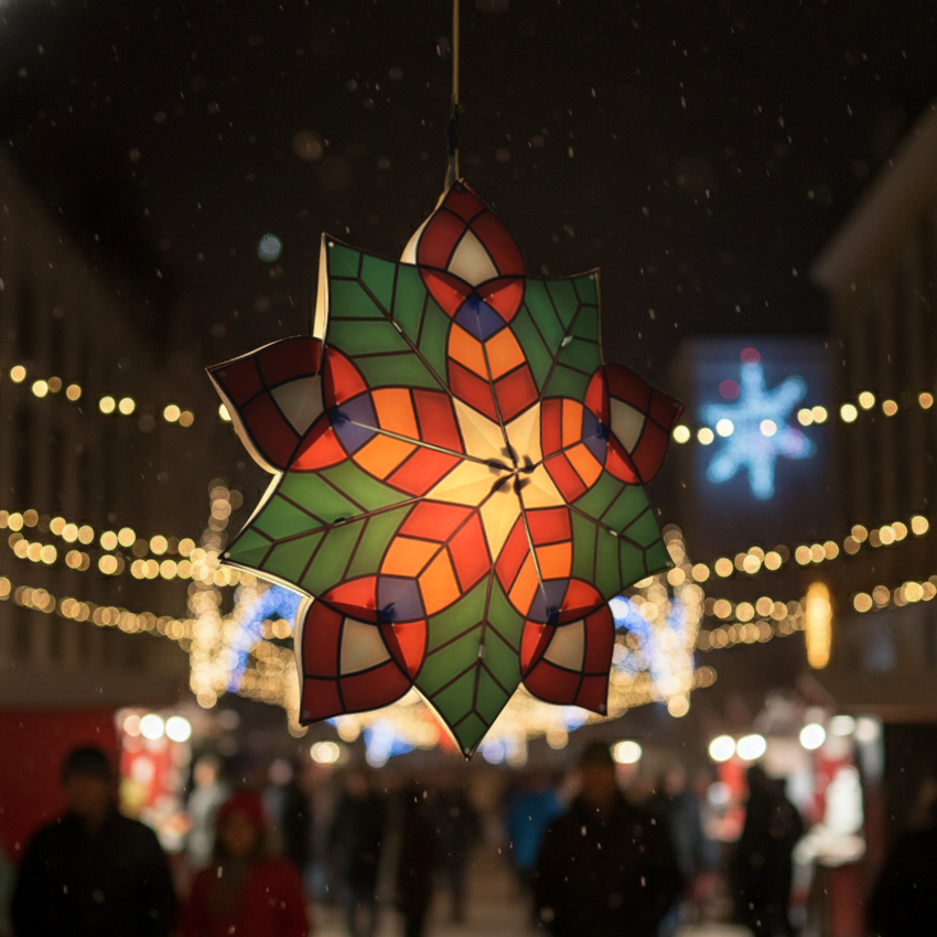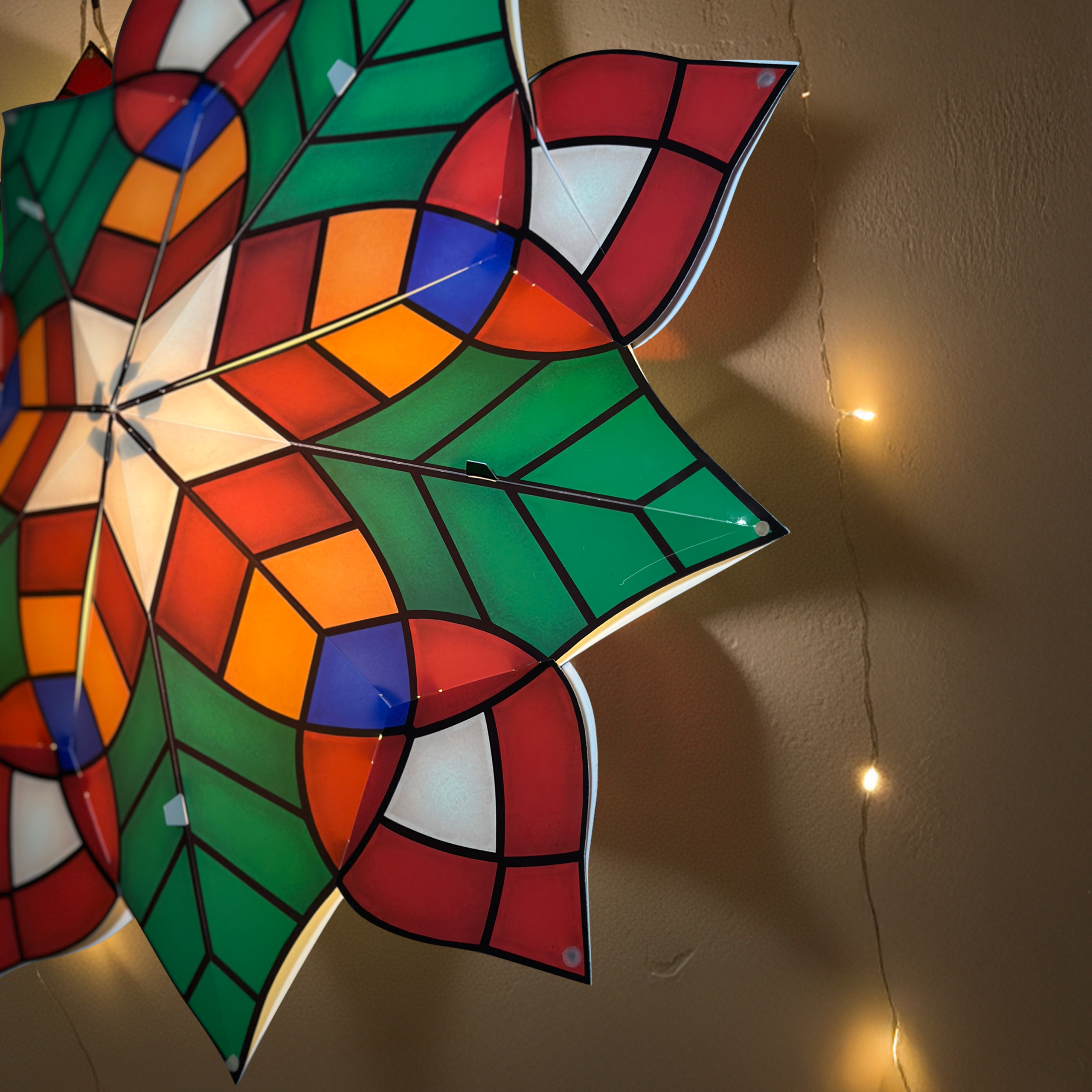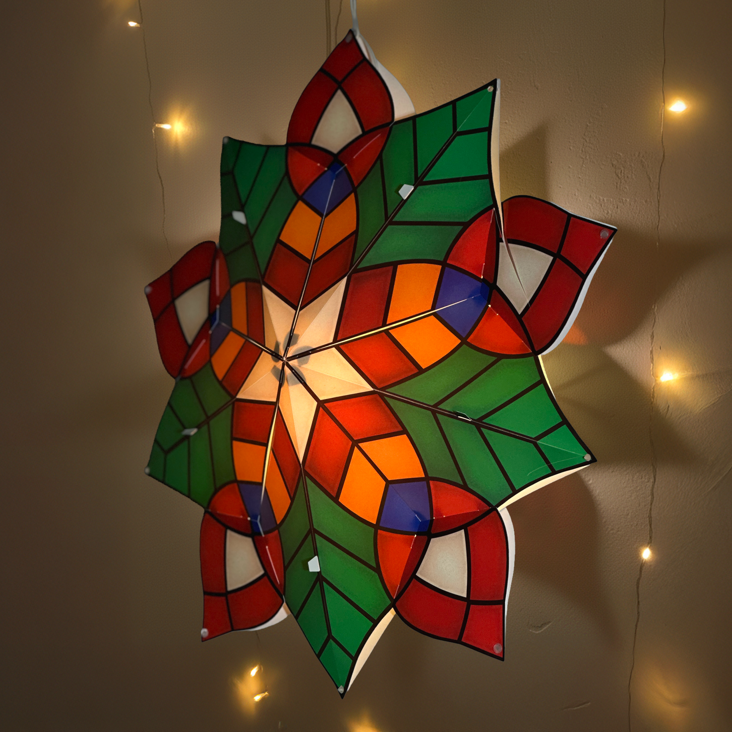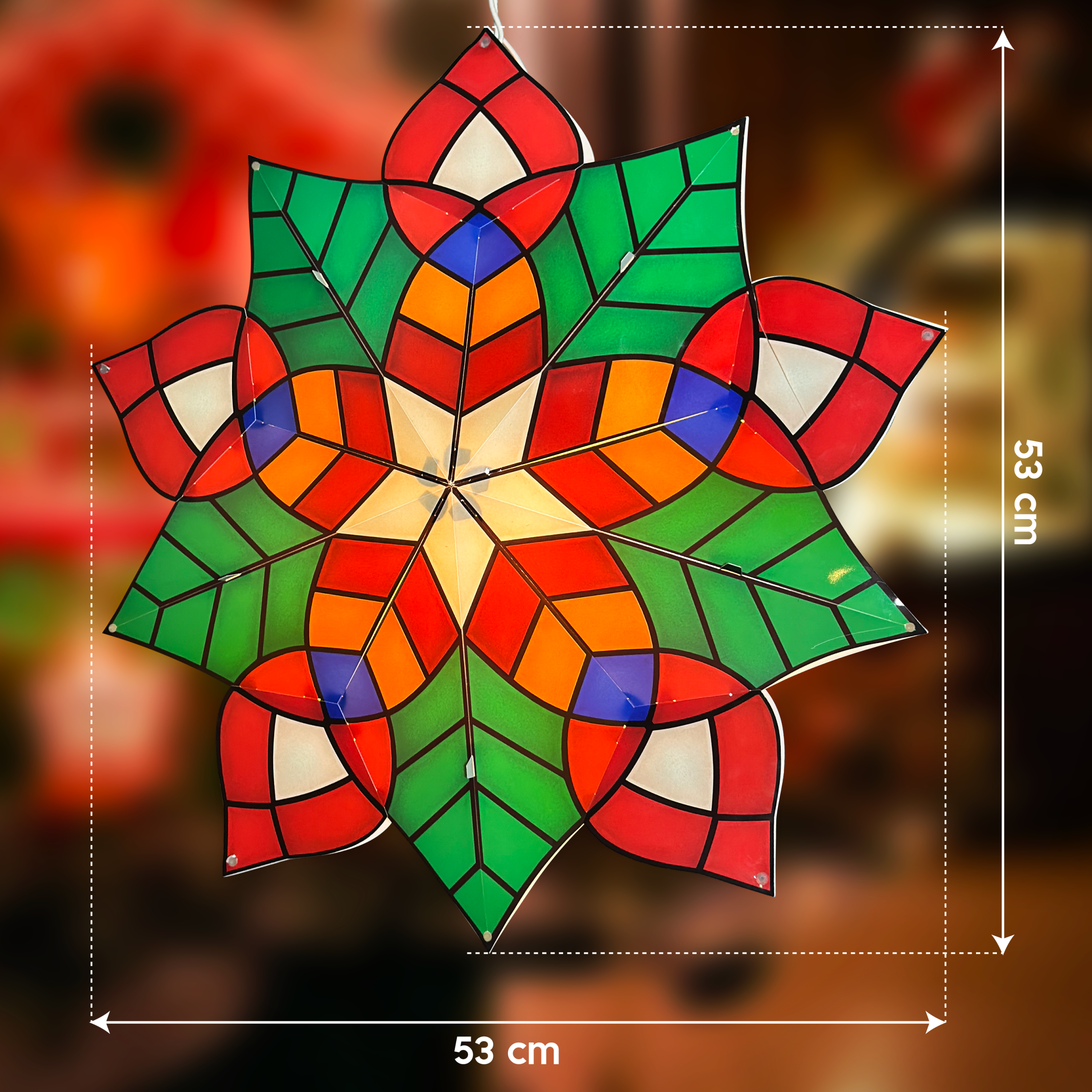 Không chỉ là một chiếc đèn, Lồng đèn ngôi sao kính màu giống như một “bức tranh ánh sáng” được ghép từ những mảnh màu rực rỡ, tạo thành hình ngôi sao tám cánh tinh xảo. Mỗi mảng màu xanh – đỏ – cam – lam kết hợp hài hòa, khi phát sáng tạo ra hiệu ứng lung linh như kính màu nhà thờ phương Tây.